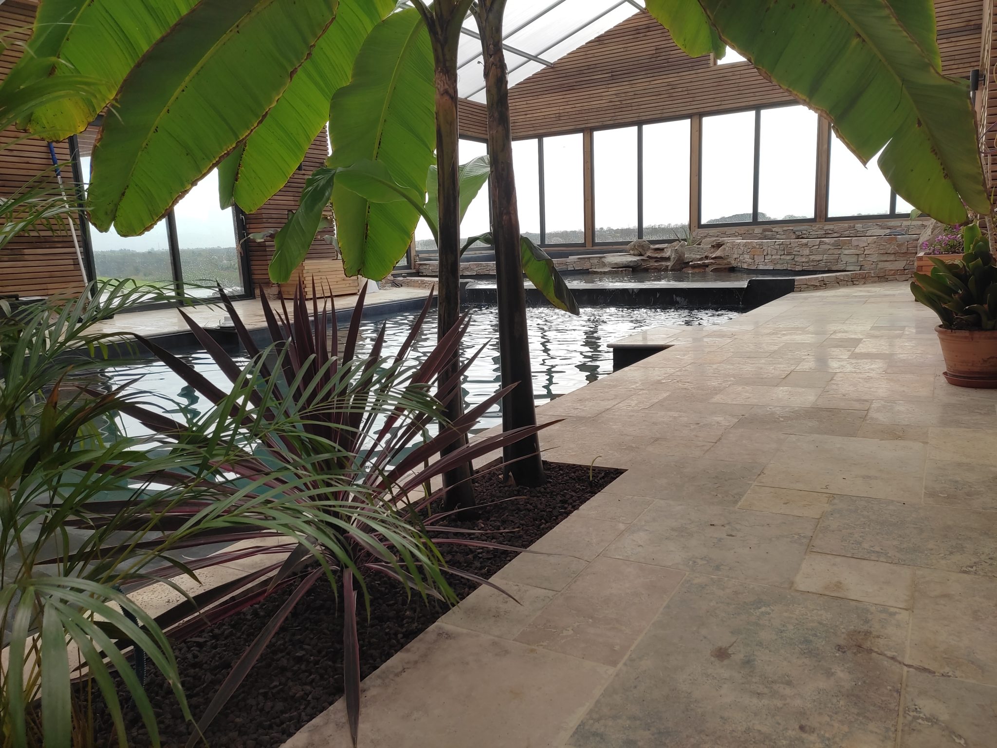 Création d’une piscine sur mesure avec cascade et lame d’eau, membrane 3D personnalisée « Aloha » et installation d’un local technique avec traitement UV